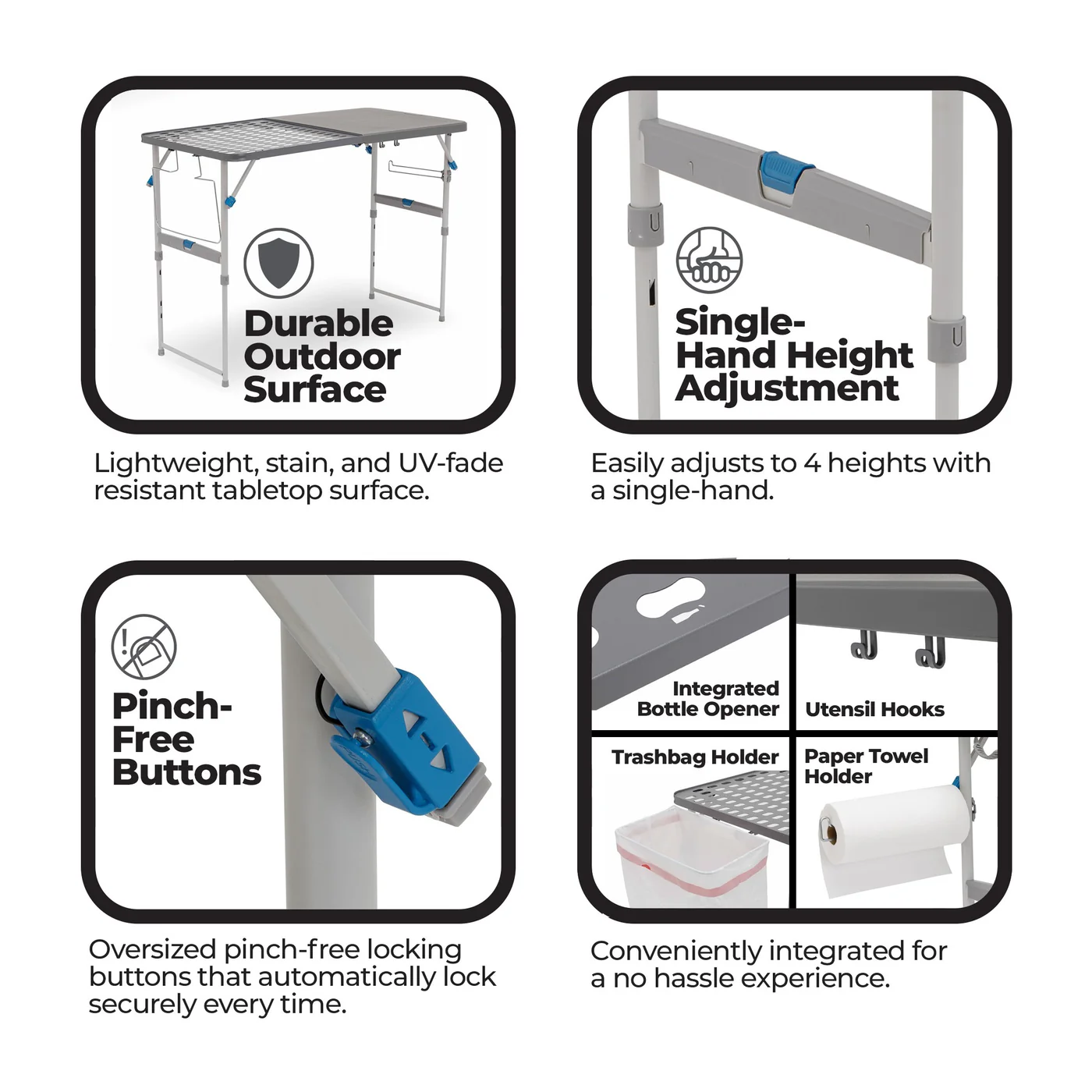 قابلیت تنظیم ارتفاع در چهار حالت مختلف باعث میشود بتوانید میز را برای غذا خوردن، آمادهسازی غذا یا حتی بازیهای گروهی تنظیم کنید. امکانات جانبی مانند نگهدارنده حوله کاغذی، جا کیسه زباله و قلابهای آویز برای لوازم آشپزی، این میز را به یک ابزار کامل برای کمپینگ تبدیل کردهاند.