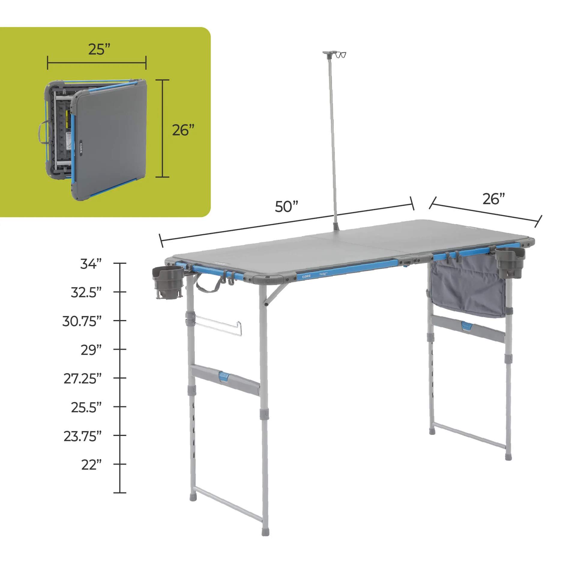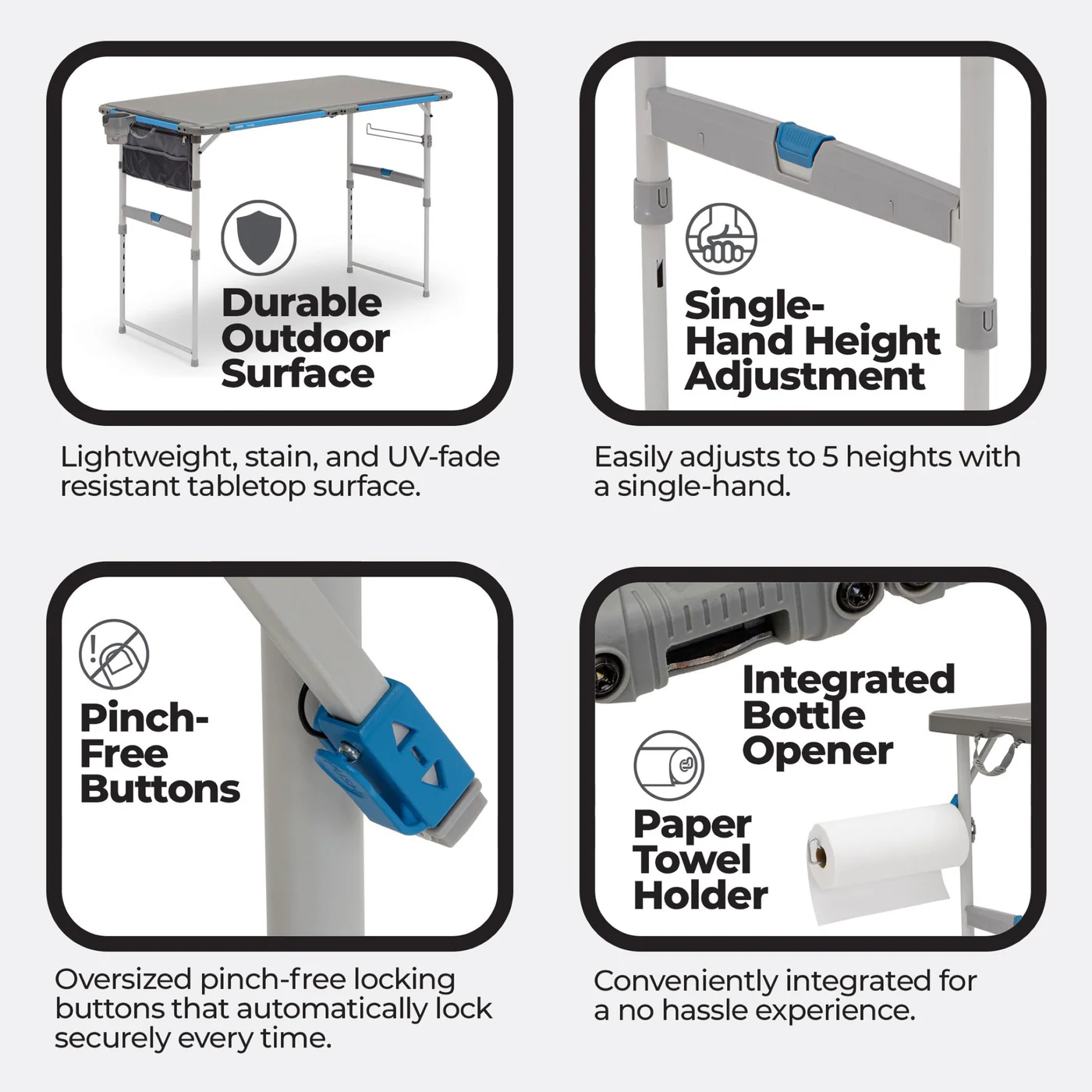 این میز سبک و آسان برای حمل و نقل با سیستم ثبت اختراع FlexRail ™ به شما این امکان را می دهد تا از طریق قلاب ها لوازم جانبی بیاویزید، محل قرار گرفت فنجان و امکان اتصال یک کیسه نگهندارنده ملزومات را به شما میدهد. این میز با داشتن درب باز کن بطری ، نگهدارنده دستمال و ارتفاع قابل تنظیم که با یک دست کنترل می شود ، برای کمپینگ ، ناهار خوری در فضای باز یا اجتماعات محیطی بسیار مناسب است.