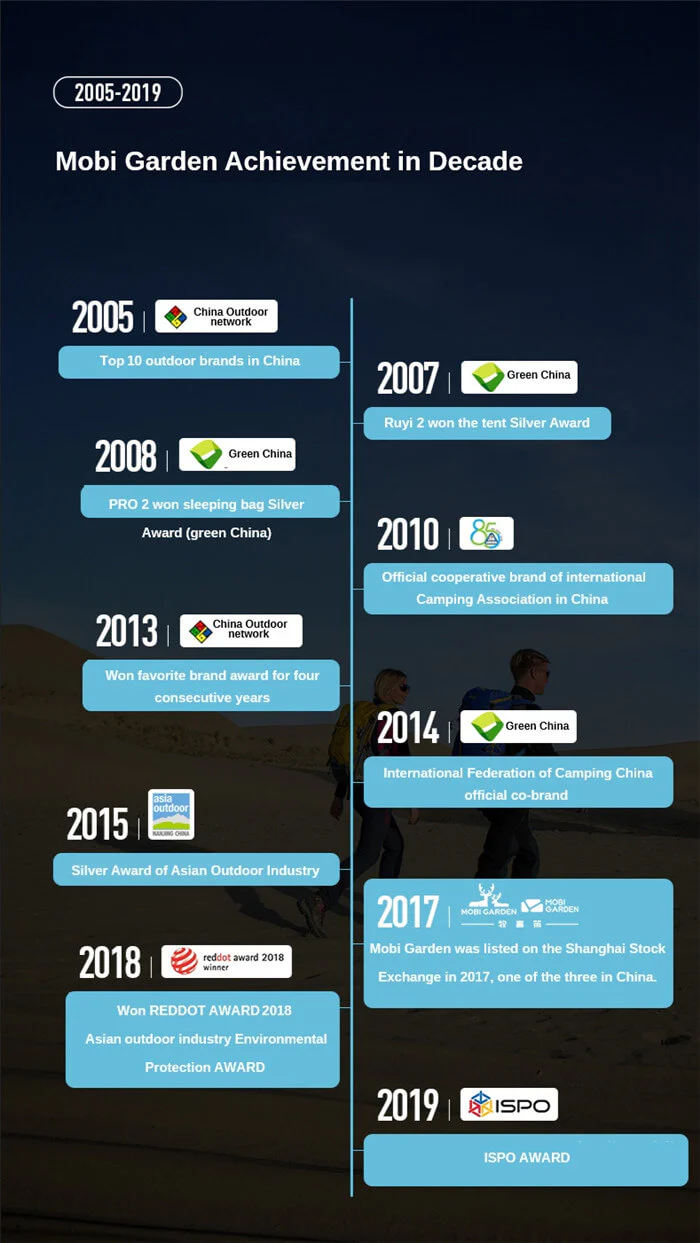 Mobi Garden یک برند طبیعتگردی چینی است که در سال 2003 تأسیس شده است و به دلیل تجهیزات حرفه ای با عملکرد بالا ، به ویژه سری چادر "کوهستان سرد" مشهور است که تجهیزات فنی با کیفیت بالا را برای علاقه مندان در دسترس قرار داده است. این برند طیف گسترده ای از محصولات ، از جمله چادرها ، کیسه های خواب ، مبلمان و پوشاک را که برای انواع فعالیت های فضای باز و سبک زندگی طراحی شده است ، از کوله پشتی گرفته تا کمپینگ خانوادگی ارائه می دهد. با یک فلسفه محوریت ارتباط افراد با طبیعت و فراهم کردن فضاهای زندگی راحت و قابل حمل در کویر، کوه و جنگل برند موبی به یک تولید کننده مشهور جهانی از تجهیزات با کیفیت در طبیعت تبدیل شده است.