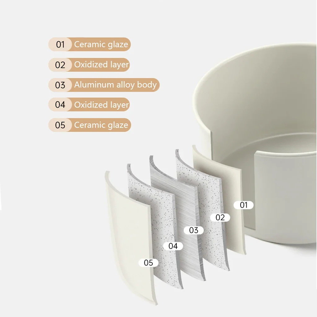 مواد تشکیل دهنده ظروف از آلیاژ آلومینیومی چند لایه 3003 است. این فلز دارای هدایت حرارتی بالایی است که به شما امکان می دهد گرما را به طور مساوی در کل سطح توزیع کنید و روند پخت و پز و کاهش مصرف سوخت را تسریع کنید. یک پوشش سرامیکی با خاصیت نچسب بودن به سطح اعمال می شود.